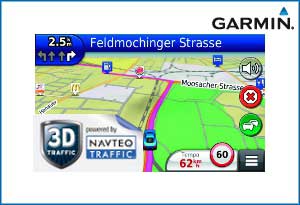 3D Traffic - powered by NAVTEQ Traffic™ innovative Software mit Verkehrsinformationen von NAVTEQ TrafficT. Mit Informationen zur dynamischen Berechnungen der Route mit aktuellen Behinderungen und Baustellen in 19 europäischen Ländern.